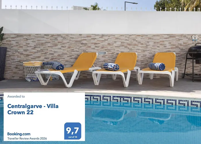 A kertre néző terasszal rendelkező 4 hálószobás Centralgarve - Villa Crown 22 Quarteira 25 perces autóútra fekszik a Faro (FAO-Faro nemzetkozi ) repülőtértől.
